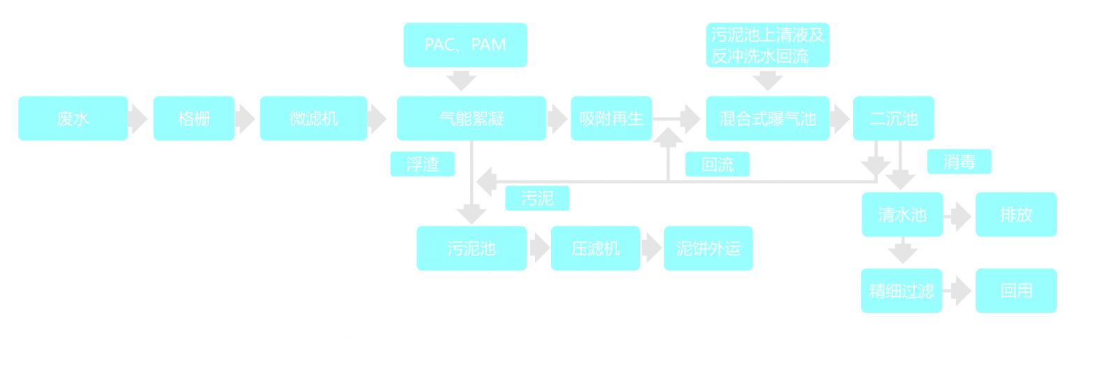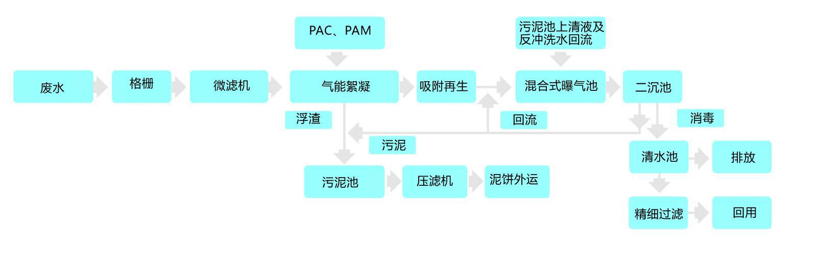 廢水通過格柵去除浮渣,經(jīng)由微濾機回收紙漿后進入氣能絮凝系統(tǒng),通過投加混凝劑,再經(jīng)其凝聚、氣浮、撇渣、沉淀、刮泥處理后可去除污水中85% 以上的SS, 50%以上的非溶解性COD及部分溶解性COD和BOD。其出水進入完全混合式曝氣池,通過向池內(nèi)補充投加N、P等營養(yǎng)物質(zhì),并利用吸附再生池增強回流污泥的微生物活性等方式高效降解污水中的有機物質(zhì)。出水經(jīng)由二沉池進行固液分離,上清液消毒達標(biāo)后外排或精細(xì)過濾后回用。