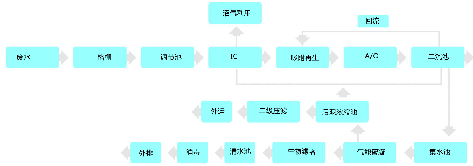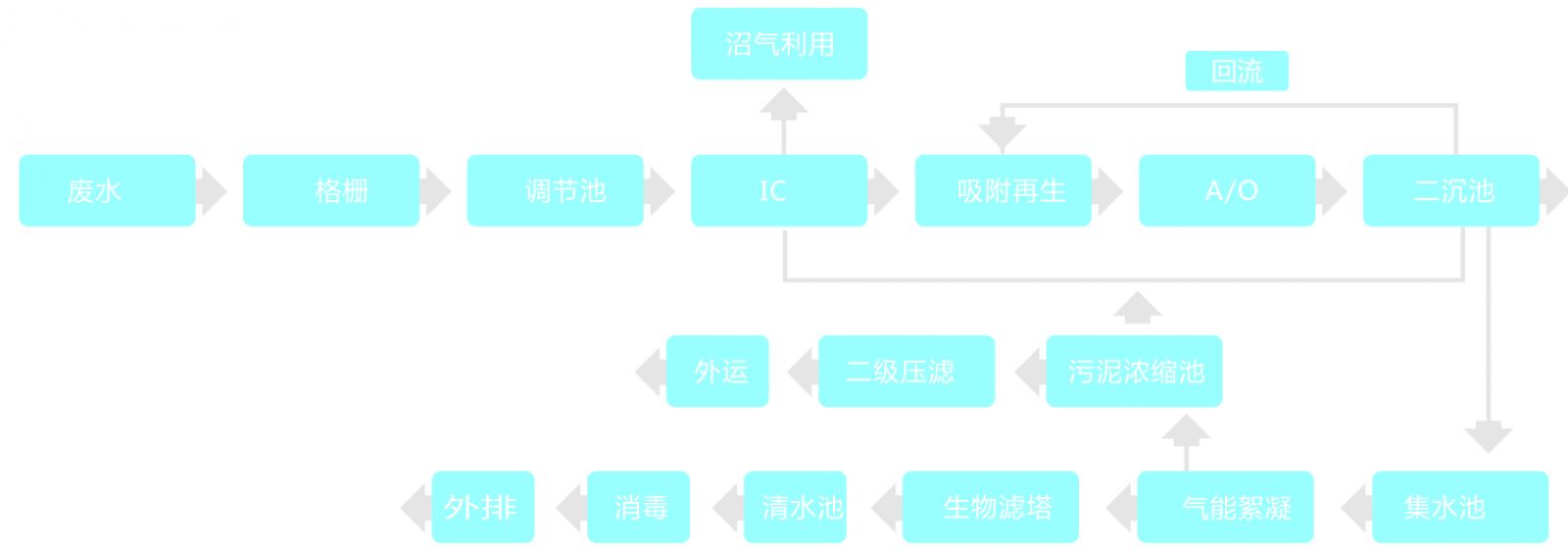 廢水經(jīng)格柵預(yù)處理,去除大的漂浮物質(zhì)后進(jìn)入調(diào)節(jié)池勻和水質(zhì)水量,調(diào)節(jié)后的污水進(jìn)入IC高效厭氧反應(yīng)器,廢水在反應(yīng)器中自下而上流動(dòng),有機(jī)污染物被高濃度的厭氧顆粒污泥吸附并降解,同時(shí)IC可以通過(guò)內(nèi)循環(huán)改善傳質(zhì)效果,并實(shí)現(xiàn)自動(dòng)稀釋進(jìn)水,不僅降低了有機(jī)物負(fù)荷,還能有效保證進(jìn)水濃度的穩(wěn)定性,極大地提高對(duì)COD等有機(jī)污染物的處理效率。出水進(jìn)入A/O反應(yīng)池,通過(guò)缺氧/好氧工段高效去除COD并實(shí)現(xiàn)脫氮功能。處理后的出水經(jīng)二沉池進(jìn)行固液分離后,進(jìn)入氣能絮凝系統(tǒng)進(jìn)一步去除水中殘留的細(xì)小懸浮物。再由具備生物代謝與吸附過(guò)濾雙重功能的生物濾塔處理,出水消毒后即可達(dá)標(biāo)外排。