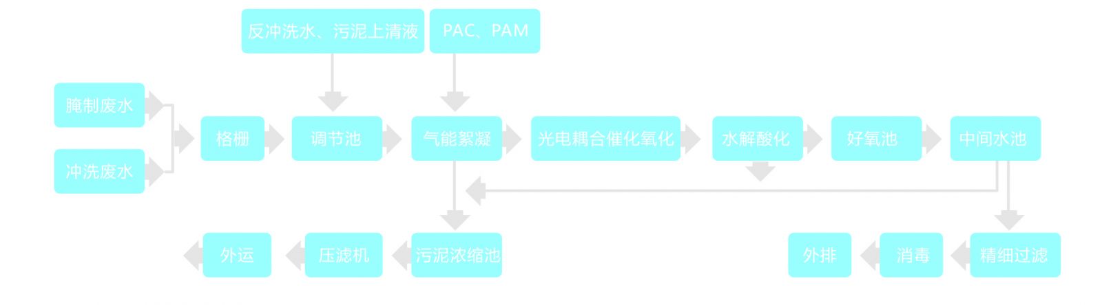 蔬菜腌制及車間沖洗廢水首先進(jìn)入格柵截留廢水中大的雜物后與各系統(tǒng)反沖洗水、污泥濃縮池的上清液匯合后進(jìn)入調(diào)節(jié)池,進(jìn)行水量和水質(zhì)調(diào)節(jié),并通過厭氧作用去除部分COD后進(jìn)入氣能絮凝系統(tǒng),通過投加絮凝劑進(jìn)一步去除污水中絕大部分懸浮態(tài)的無機及有機雜質(zhì),出水進(jìn)入光電耦合催化氧化反應(yīng)器,通過電解降低廢水中所含的高鹽成分,提高活性極強的羥基自由基的產(chǎn)率,通過加成、取代、電子轉(zhuǎn)移等反應(yīng),將廢水中大部分有機污染物轉(zhuǎn)化為簡單無機物。出水經(jīng)過水解酸化后進(jìn)入好氧池,進(jìn)一步去除COD、氨氮等各類污染物,再經(jīng)多級精細(xì)過濾、消毒后達(dá)標(biāo)排放。