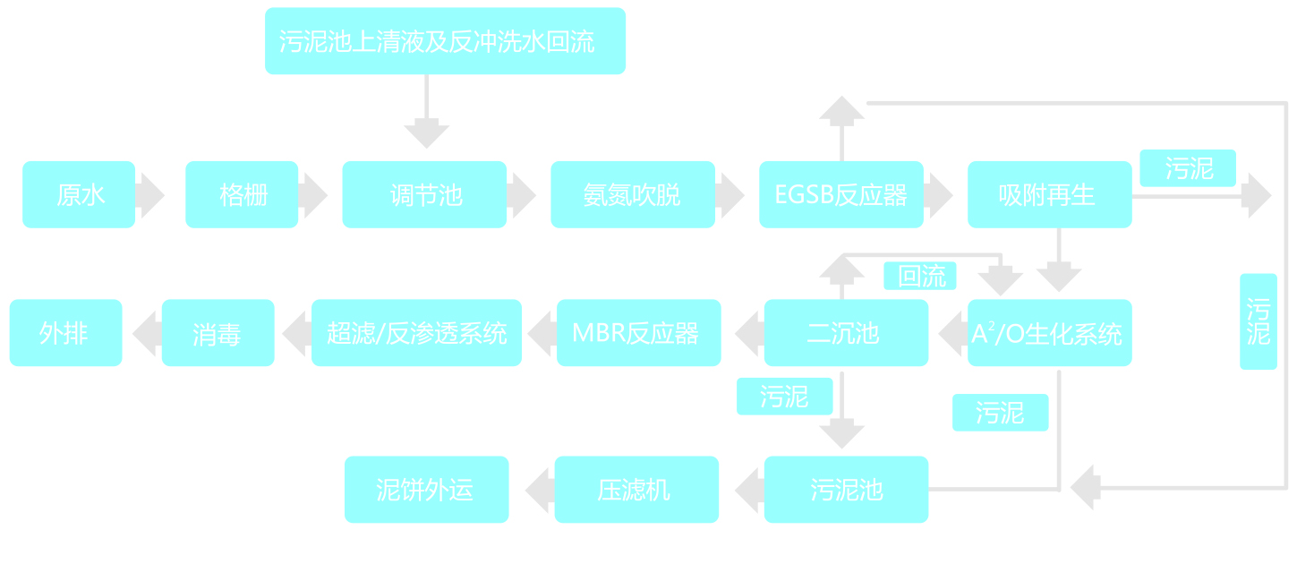 經(jīng)過格柵的垃圾滲濾液與其它地表污水混合后,進調(diào)節(jié)池進行水質(zhì)水量的均和,再通過吹脫塔去除所含的氨氮污染物質(zhì),調(diào)pH值后進入EGSB反應(yīng)器,利用反應(yīng)器內(nèi)形成的厭氧顆粒污泥高效降低COD,出水經(jīng)由A2/O進一步降解有機污染物,并高效去除污水中氮、磷,二沉池出水通過超濾/反滲透系統(tǒng)對重金屬離子進行精細(xì)處理,出水經(jīng)消毒達標(biāo)后外排。