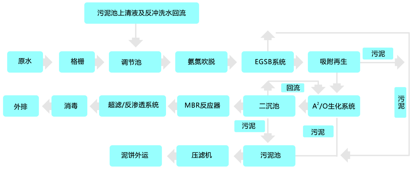 EGSB反應(yīng)器、吸附再生池及二沉池產(chǎn)生的剩余污泥收集于污泥池,濃縮并經(jīng)壓濾機脫水后外運。