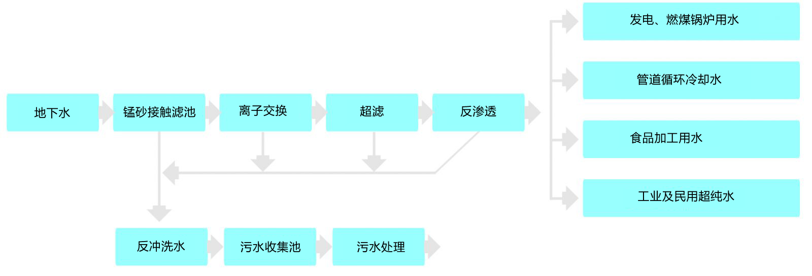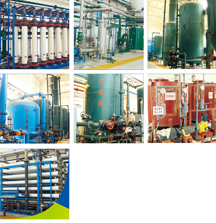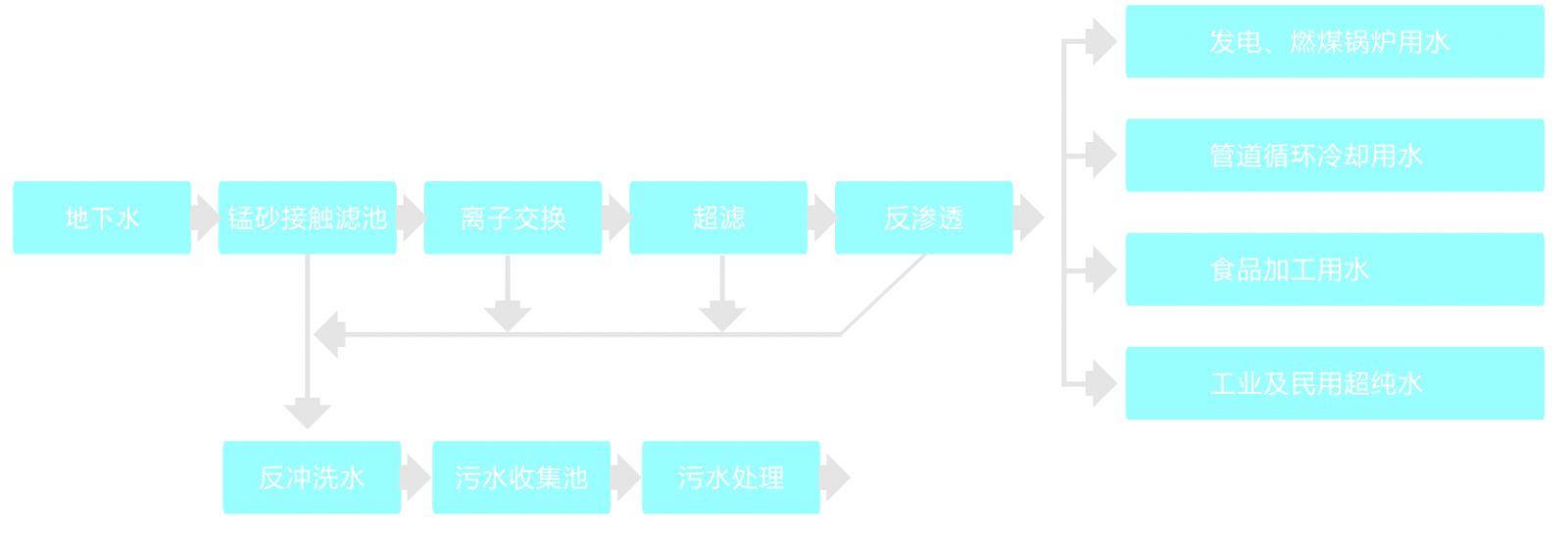 首先采用射流曝氣器讓地下水與空氣中的氧充分接觸,讓Fe2+、Mn2+氧化生成Fe3+、Mn4+,通過(guò)吹脫的原理,降低進(jìn)入曝氣器中空氣的CO2含量,提高pH,并通過(guò)除鐵錳過(guò)濾器里錳砂濾料的催化氧化作用,在濾層表面加速形成大量的金屬氫氧化物,可將其高效吸附截留在濾層孔隙中得以去除。當(dāng)濾層達(dá)到吸附飽和后采用氣水聯(lián)合沖洗,使濾料得以再生。濾后水進(jìn)入離子交換系統(tǒng),利用陽(yáng)性樹脂交換基團(tuán)里的鈉離子同水中的鈣、鎂離子進(jìn)行交換,以此降低水的硬度。樹脂飽和后可通過(guò)鹽水再生循環(huán)使用。出水經(jīng)超濾和反滲透處理后徹底濾除水中的細(xì)菌、金屬離子、大分子有機(jī)物等有害物質(zhì),可用于燃煤鍋爐發(fā)電、工業(yè)管道循環(huán)冷卻、工業(yè)及民用超純水、食品加工及其它特殊行業(yè)用水。