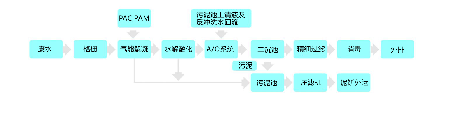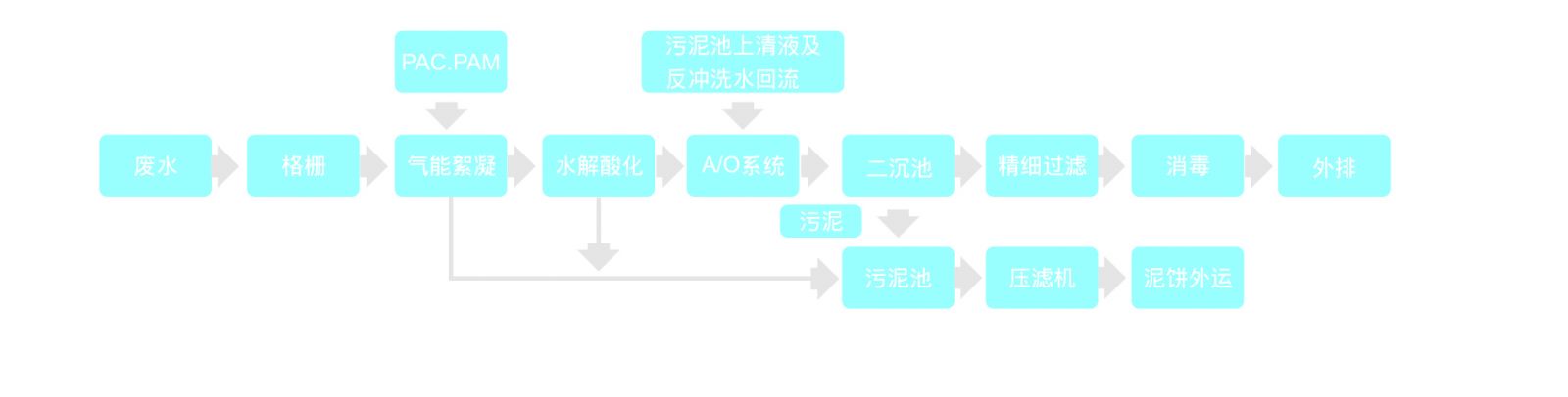 生產(chǎn)廢水經(jīng)過格柵排至氣能絮凝系統(tǒng),加入混凝藥劑,去除廢水中的色度和懸浮物后進(jìn)入水解酸化池,將廢水中溶解性大分子有機(jī)物轉(zhuǎn)化為結(jié)構(gòu)簡單的小分子物質(zhì),提高廢水可生化性,出水接著進(jìn)入A/O系統(tǒng),通過缺氧/好氧工段高效去除COD并實(shí)現(xiàn)脫硝,經(jīng)二沉池進(jìn)行固液分離,上清液經(jīng)精細(xì)過濾、消毒后達(dá)標(biāo)外排。