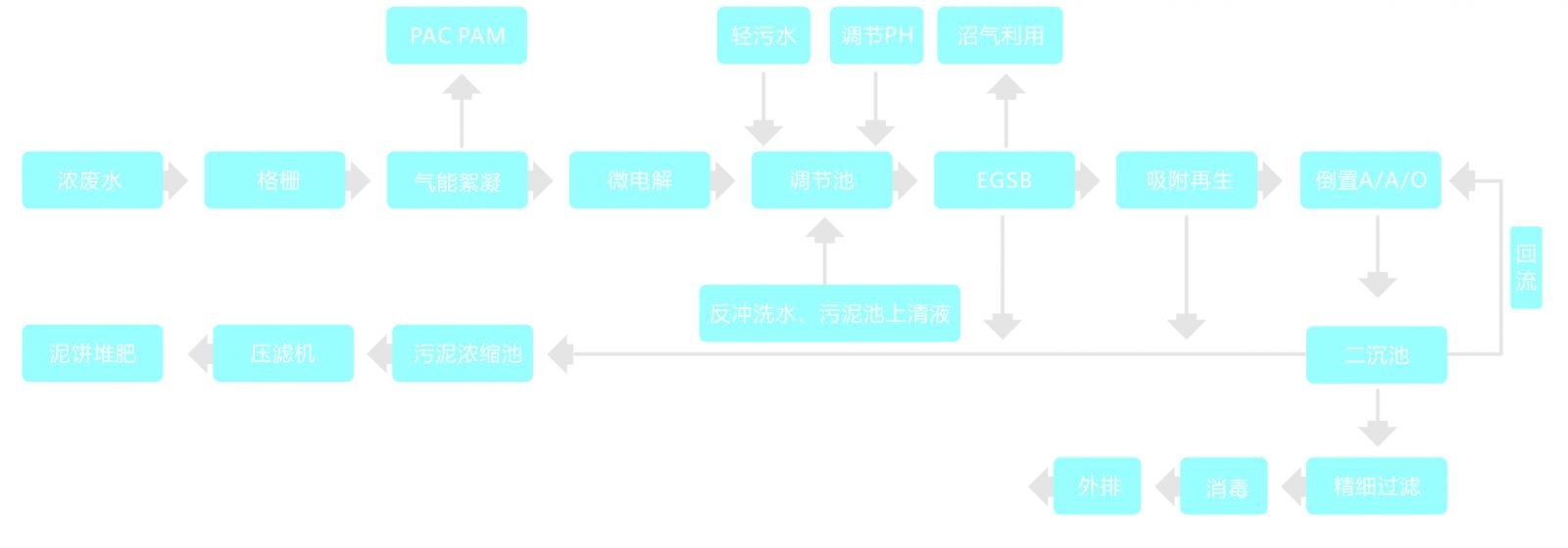 首先對濃污進(jìn)行預(yù)處理,原水進(jìn)入氣能絮凝系統(tǒng)去除懸浮物,進(jìn)入鐵碳微電解系統(tǒng),通過電絮凝原理去除部分磷及COD,處理后的出水和輕污在綜合調(diào)節(jié)池內(nèi)調(diào)勻后進(jìn)入EGSB反應(yīng)器進(jìn)行厭氧處理,在高效降解COD的同時利用原水中豐富的有機(jī)質(zhì)產(chǎn)生沼氣,用于廠區(qū)內(nèi)的鍋爐發(fā)熱,實現(xiàn)循環(huán)利用。